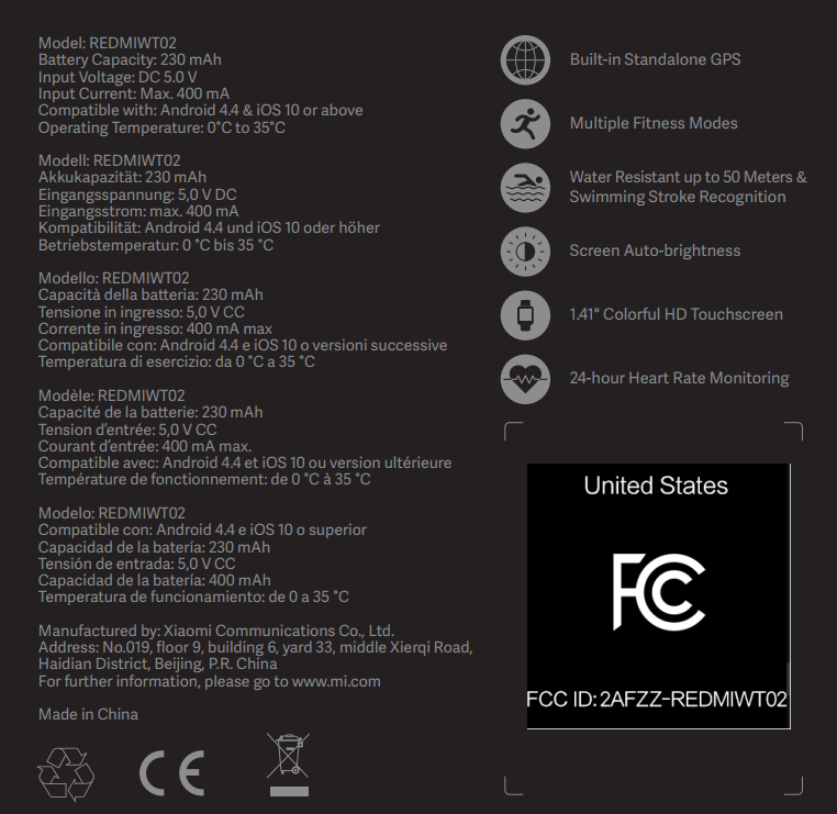 حصلت الساعة مؤخرًا على شهادة MIIT في سبتمبر الماضي، حيث كشفت رقم طرازها REDMIWT01. وفي نفس الشهر ، تم رصد Xiaomi Mi Watch Lite برقم الطراز REDMIWT02 في شهادة UL (ديمكو). ونظرًا لأن كلاهما لهما أرقام طراز متشابهة، يبدو أن Redmi Watch يمكن توفيرها مع اسم Xiaomi Mi Watch Lite في الأسواق خارج الصين.